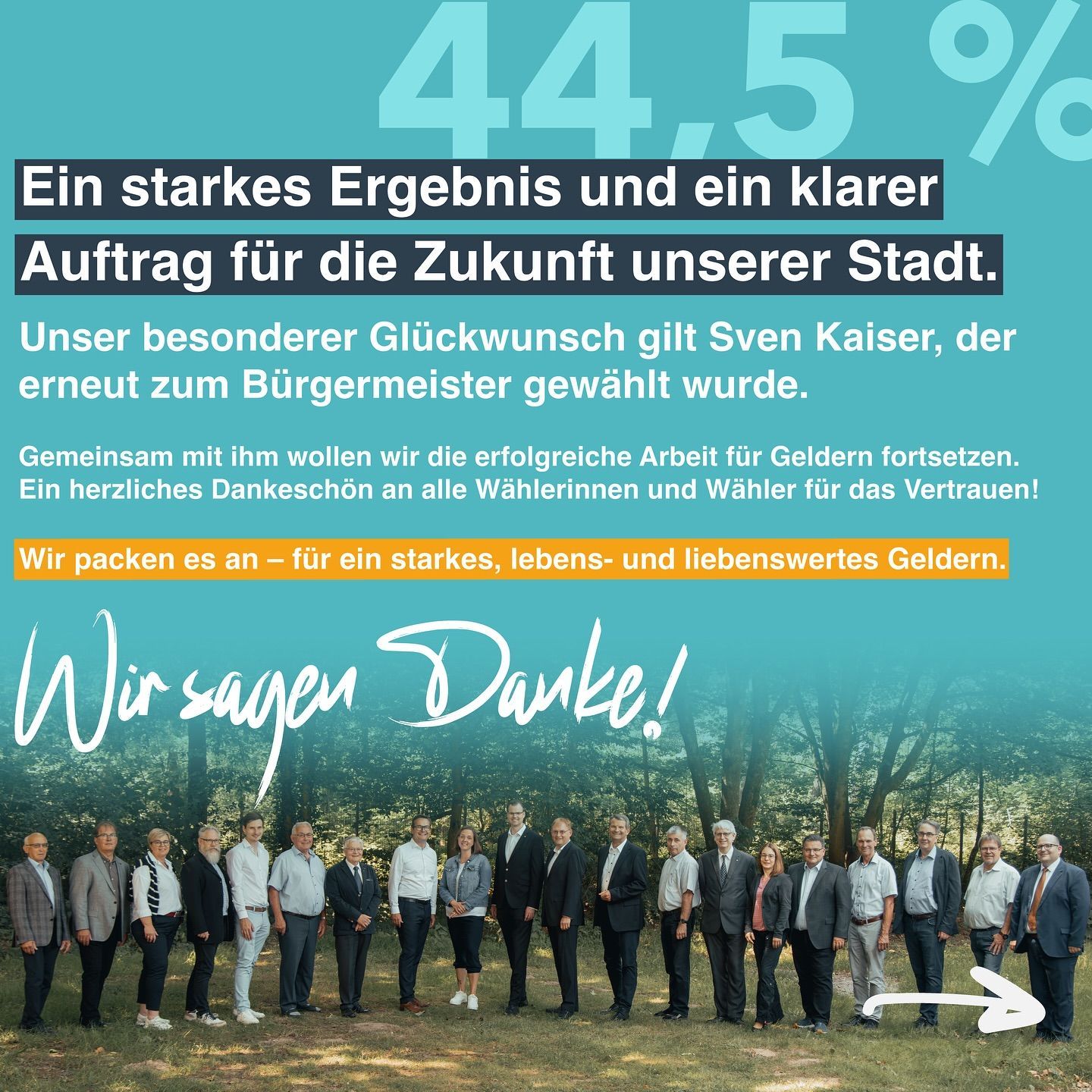 Vertrauen bestätigt – @sven.kaiser.geldern bleibt Bürgermeister! Mit 44,5 % haben wir als CDU die klare Mehrheit erreicht. Dieses Ergebnis ist ein großer Vertrauensbeweis – und ein klarer Auftrag für unsere Arbeit in den kommenden Jahren. Herzlichen Glückwunsch an Sven Kaiser, der erneut zum Bürgermeister gewählt wurde! Gemeinsam mit ihm werden wir Geldern weiter erfolgreich gestalten. Ein herzliches Dankeschön an alle Wählerinnen und Wähler für Ihre Unterstützung. ❤️
