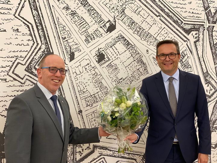Foto: Bürgermeister Sven Kaiser (r.) gratulierte Norbert Clancett nach der Ratssitzung zur Wahl des neuen Ortsbürgermeisters (Foto: Stadt Geldern)